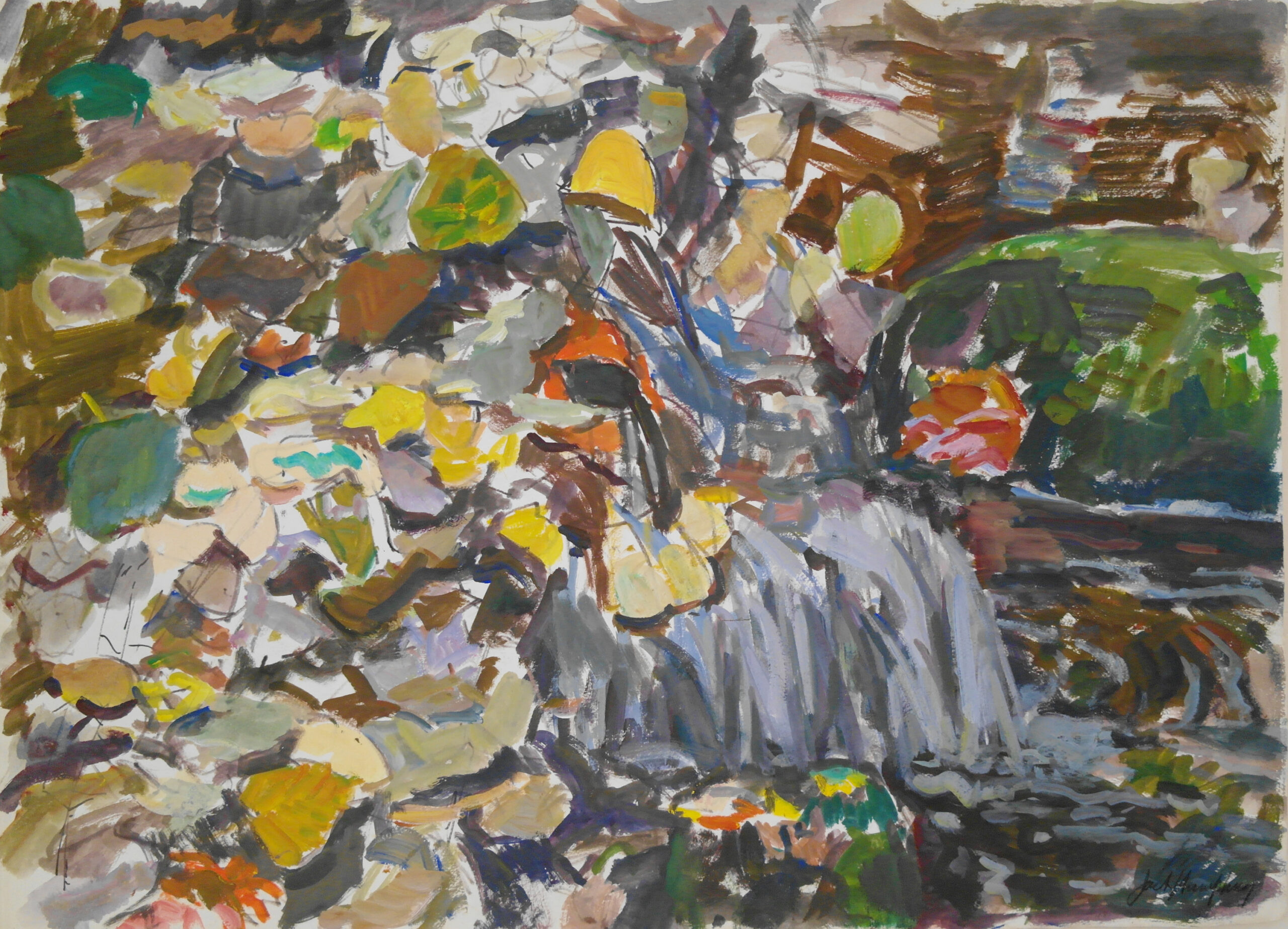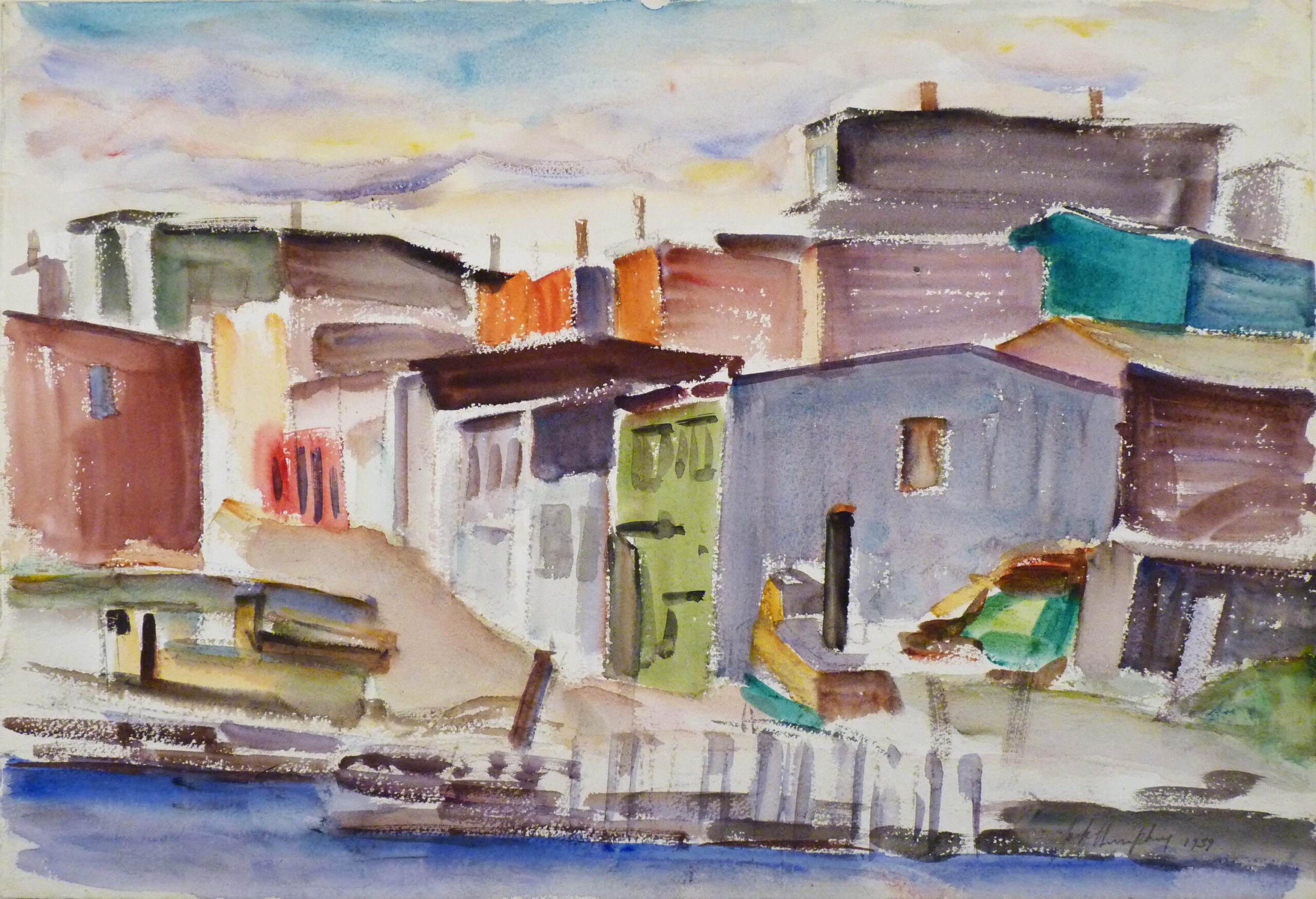 Between 1931 and 1967, Humphrey’s name became synonymous with watercolour views of Saint John and the towns and villages along the Fundy coast as well as the Saint John (Wolastoq) and the Kennebecasis Rivers. As he garnered an increasingly national reputation for the quality of his work, those depictions became the way that New Brunswick was perceived and understood across the country. Not long after his return from travelling, he led children’s art classes where he found sitters for a powerful series of portraits that achieved wide acclaim. Some national recognition early in the 1950s and a study year in France allowed him to expand his repertoire as his work forayed more and more into subtle, painterly abstraction.
